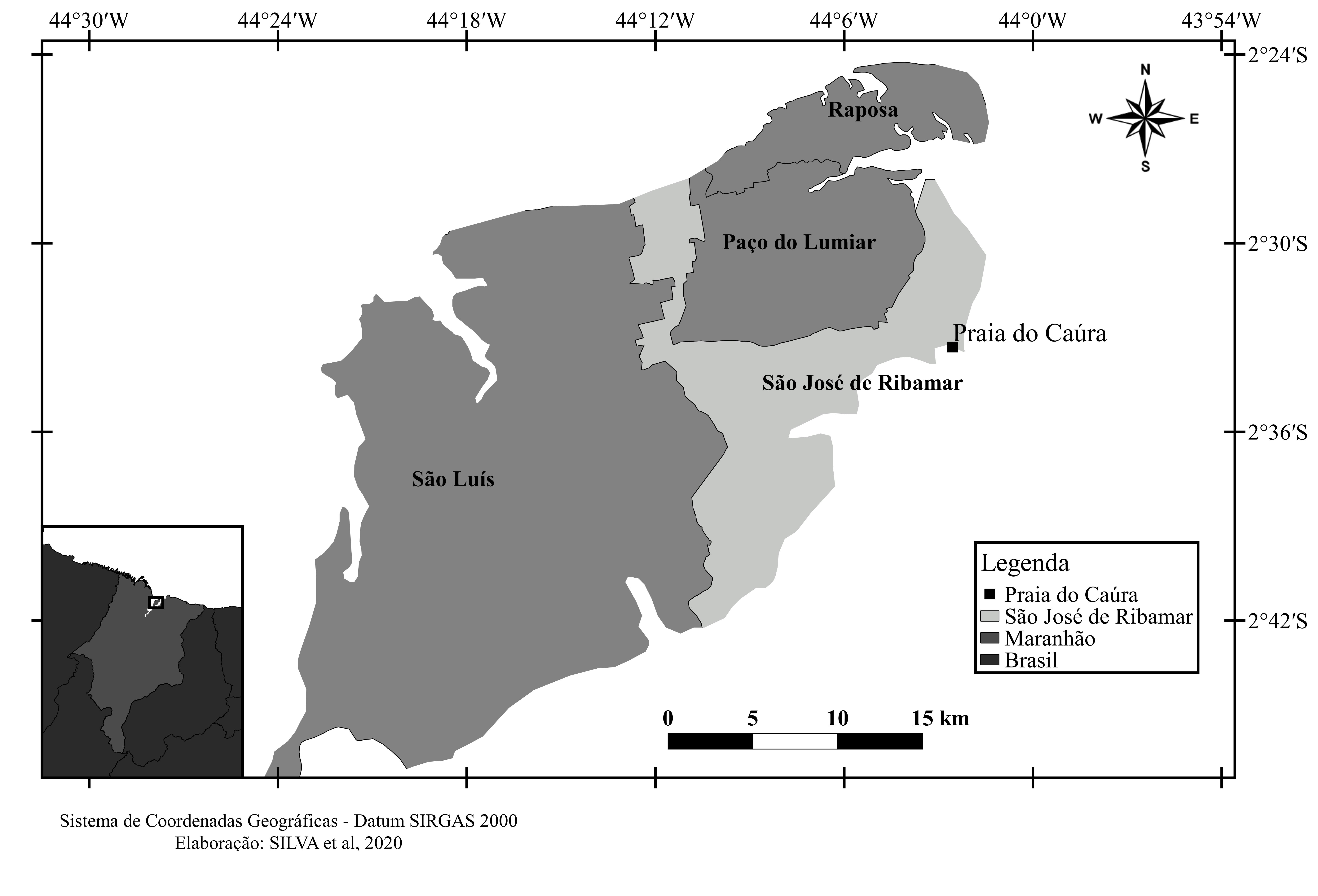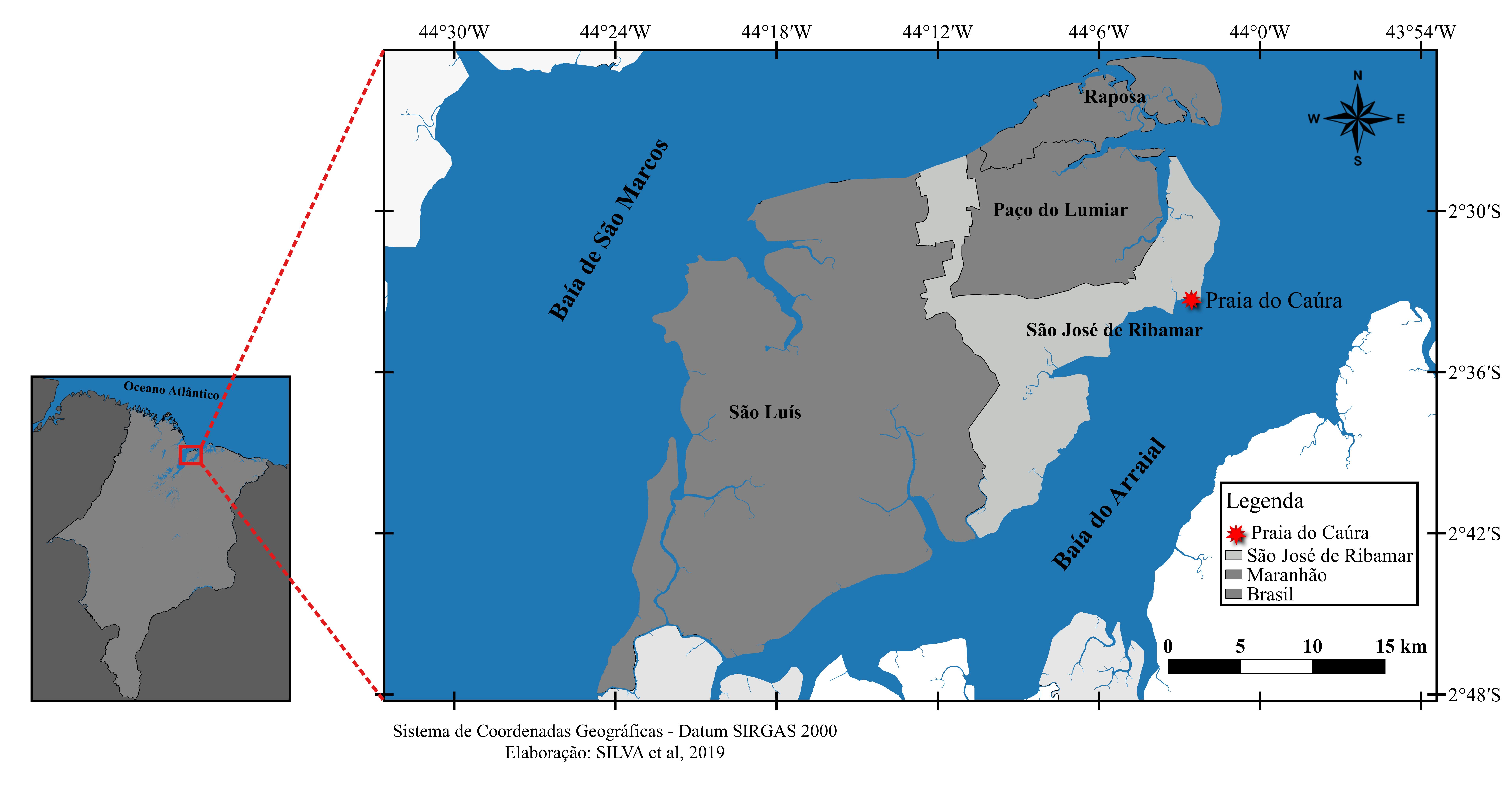 - Figura 1. Mapa mostrando a localização da Praia do Caúra, situada no município de São José de Ribamar, na porção nordeste da Ilha do Maranhão, Maranhão.