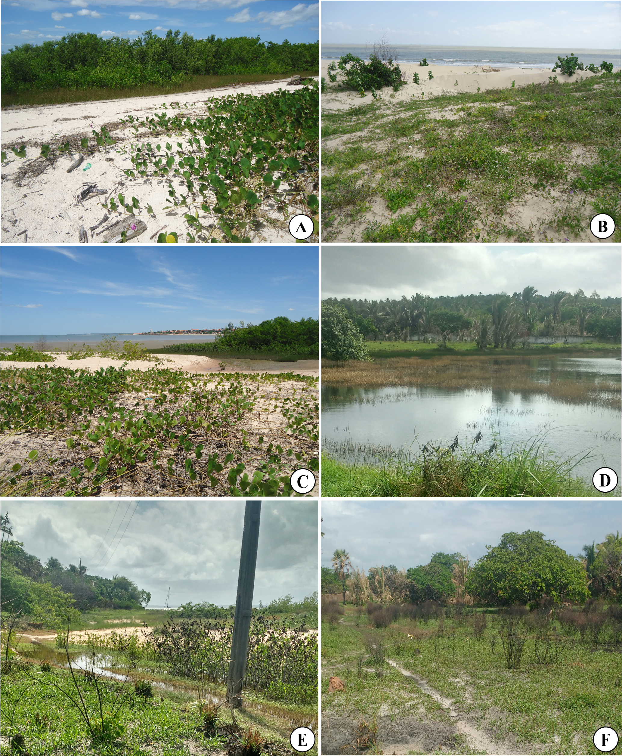 - Figura 2 A-F: Imagens da vegetação de restinga com destaque para o mosaico de fitofisionomias registradas na Praia do Caúra, São José de Ribamar, Maranhão.