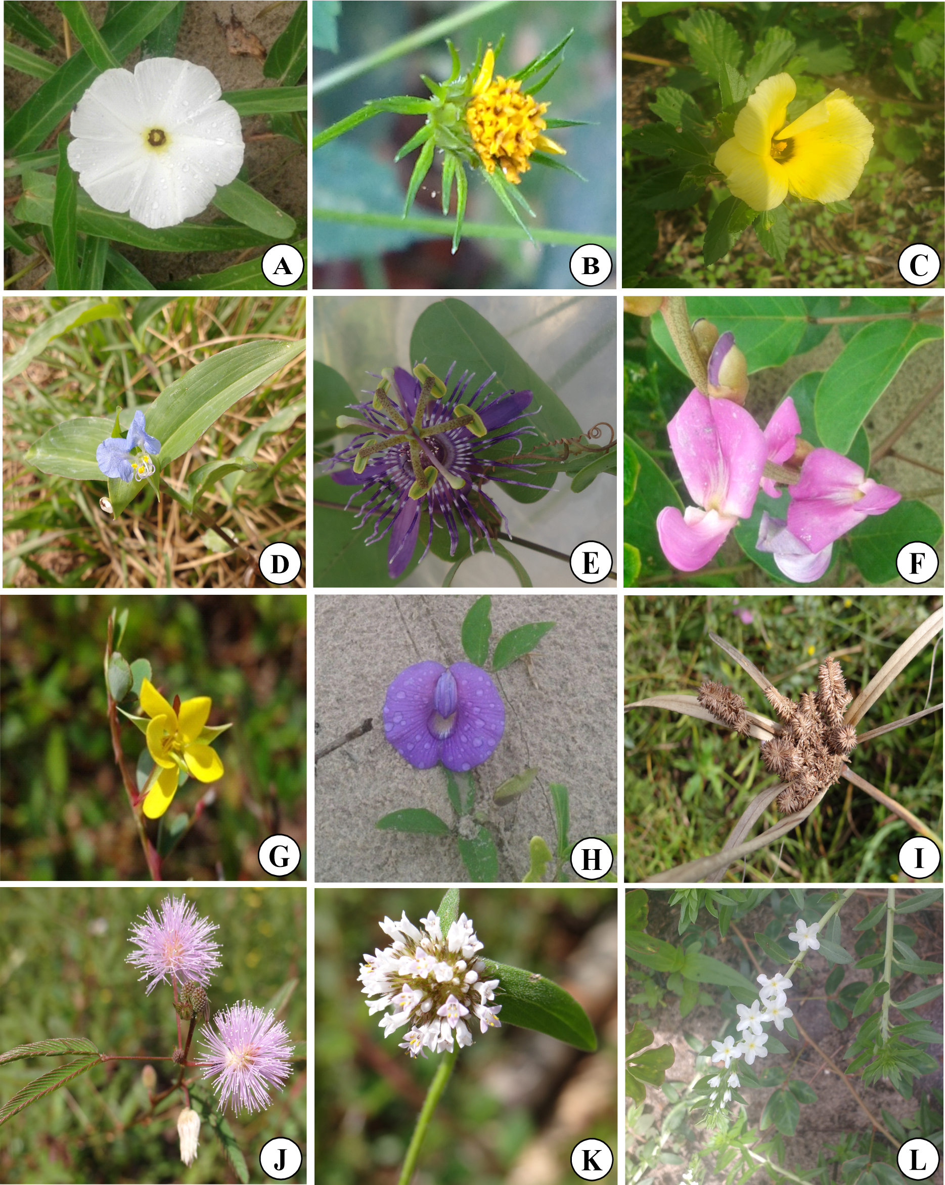 - Figura 4 - A-L: Espécies coletadas na área de estudo. A- Ipomoea imperati; B- Bidens riparia; C- Turnera subulata; D- Commelina erecta; E- Passiflora foetida; F- Canavalia rosea; G- Chamaecrista diphylla; H- Centrosema brasilianum; I- Cyperus ligularis; J